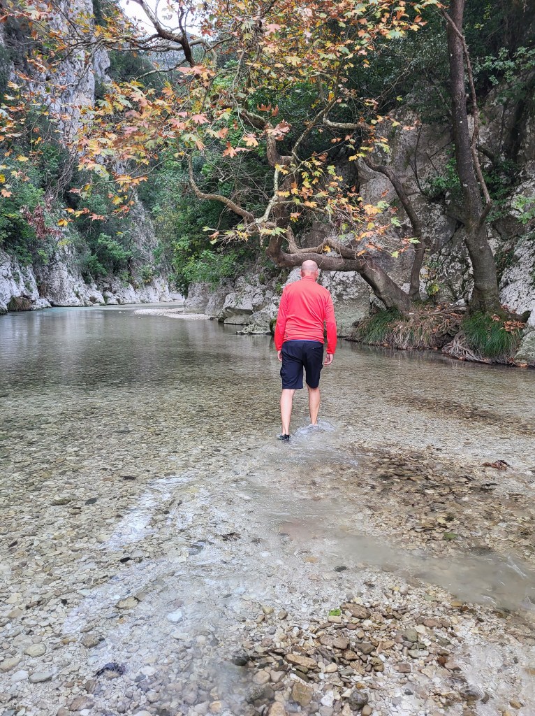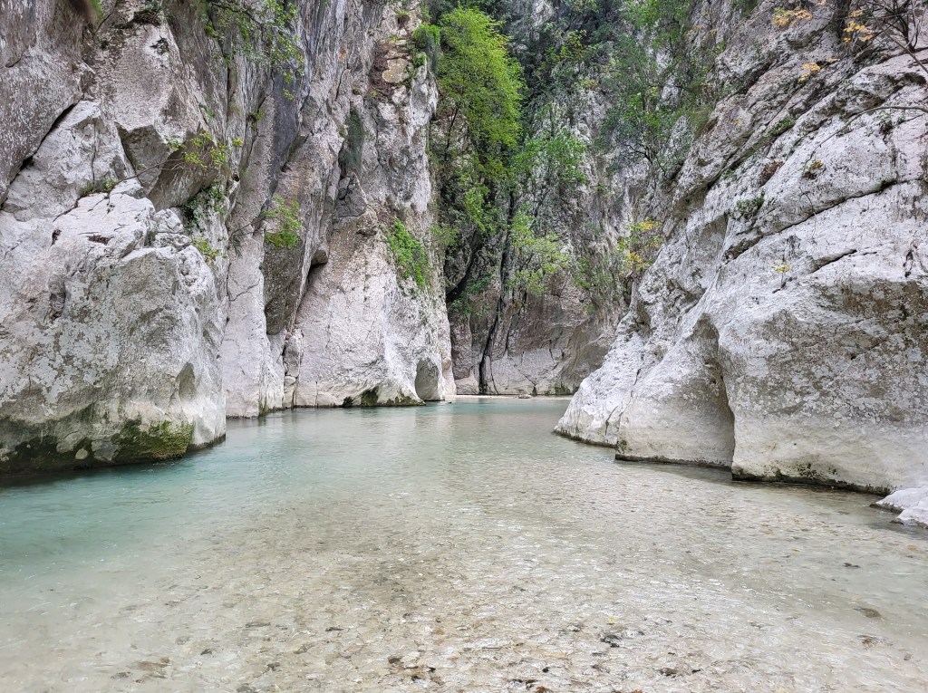 Wir gingen ein Stück in die Schlucht, überall sprudelt es aus den seitlichen Felsen raus, immer wieder Quellen. Da hat sich die“Unterwelt“ eine wirklich schöne Schlucht ausgesucht. Leider war das Wasser eisig kalt, sodass wir nach einem kurzen Stück wieder umgekehrt sind.