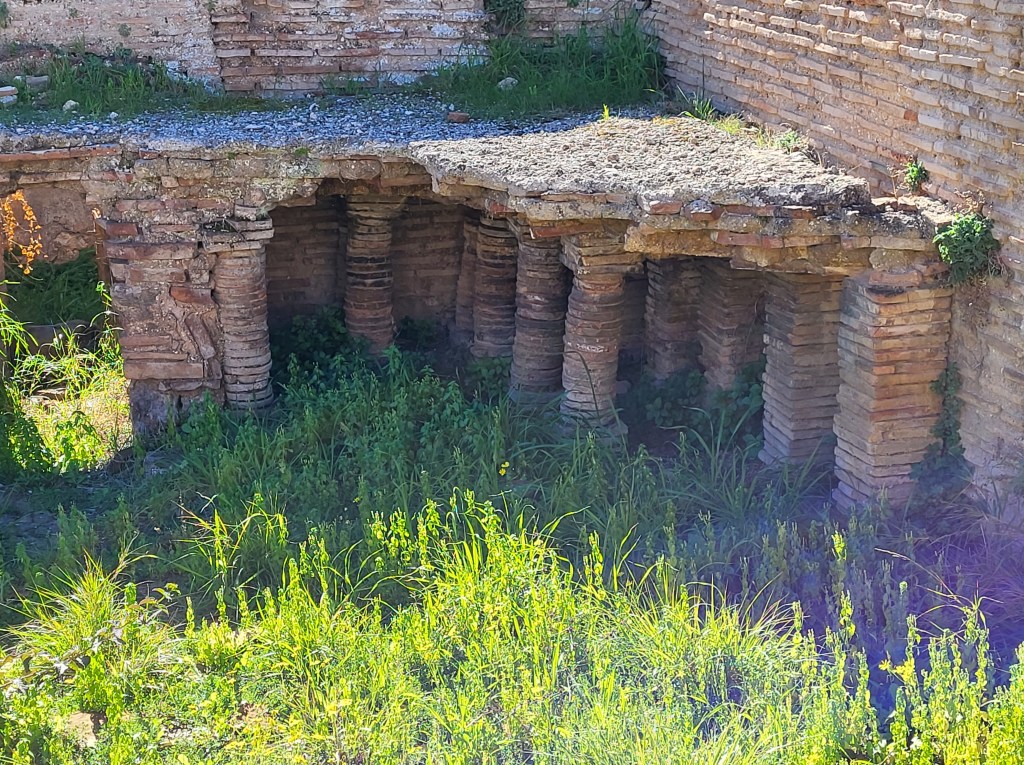 Der Unterboden der Therme, hier floss das warme Wasser und der Boden wurde schön warm, es gab also damals schon eine Fußbodenheizung. Das Amphitheater konnte 20 000 Besucher aufnehmenDie Prozessionsspinner waren hier fleißig unterwegs, es war deswegen nichts abgesperrt