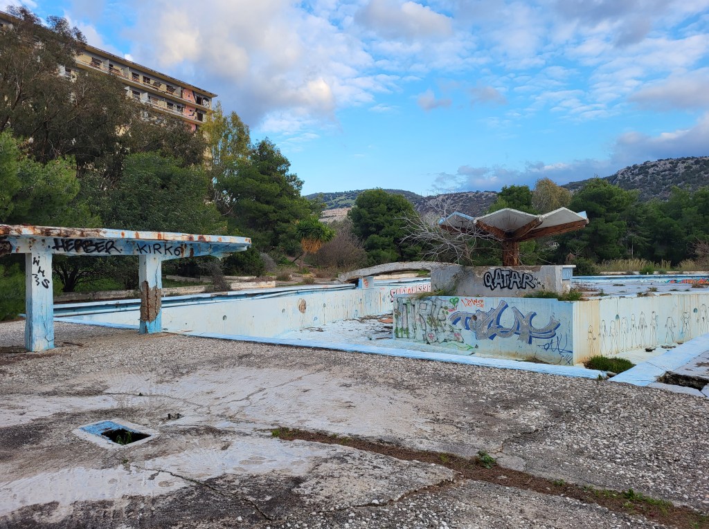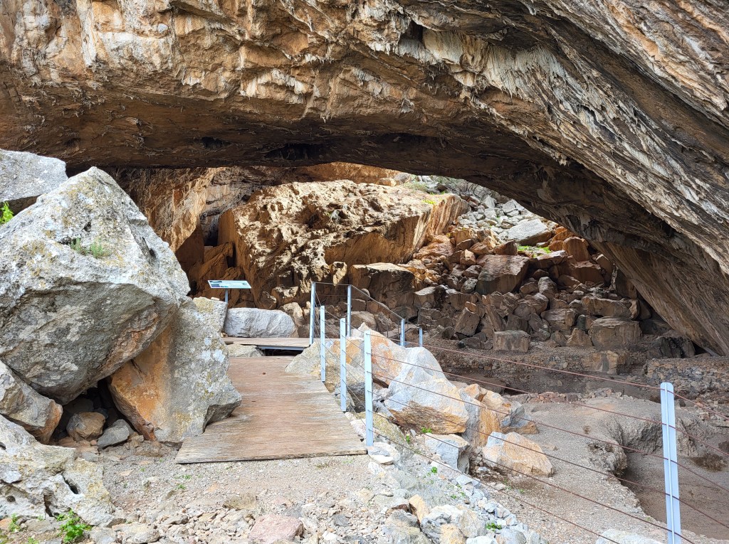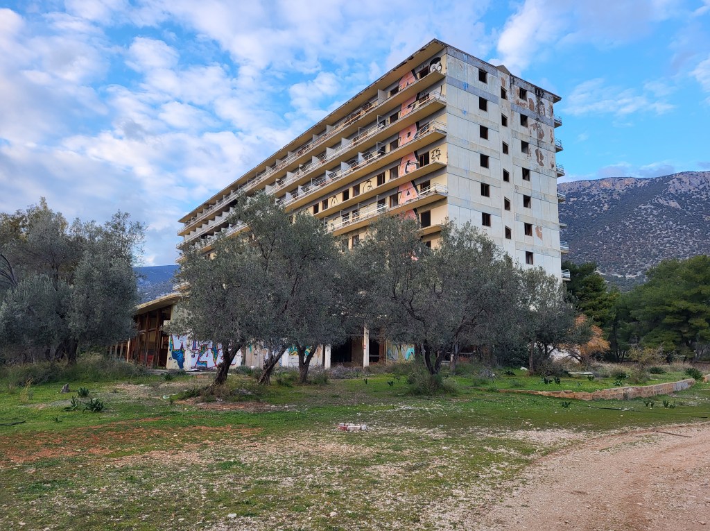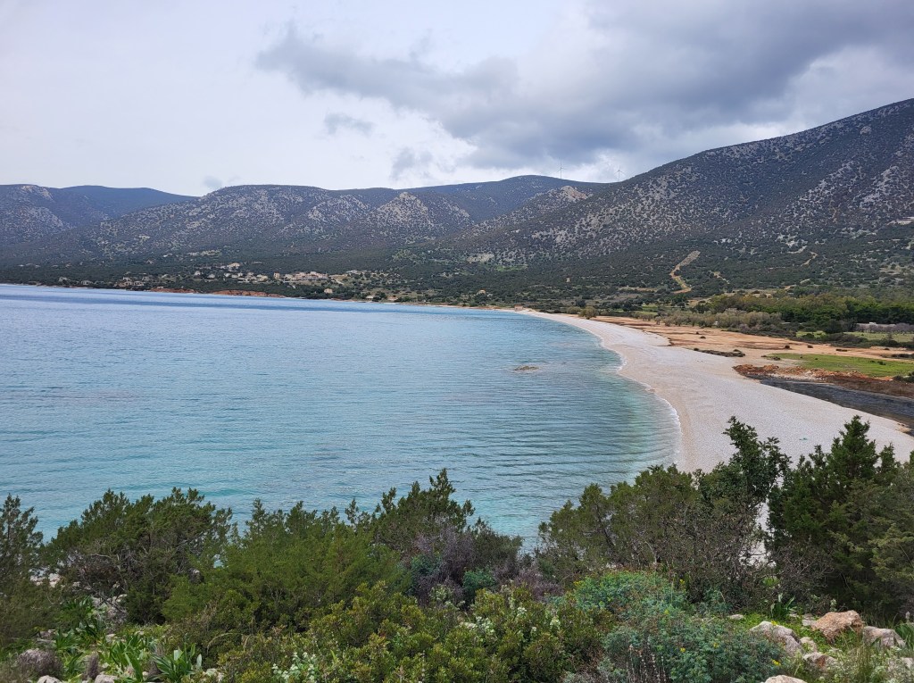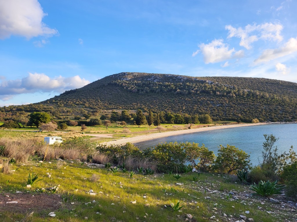 Die größere Doline. Hier haben wir auch noch Drohnenaufnahmen Echt beeindruckende Höhe der größeren DolineWenn man genauer hinschaut sieht man das Hotel, das mitten in der schönen Bucht steht. Das Hotel ist ursprünglich als FKK Hotel geplant gewesen, was aber die Griechen in der Umgebung absolut nicht wollten. Danach wurde es zu einem normalen Hotel umfunktioniert, aber ohne Erfolg. Jetzt steht es schon über 28 Jahre hier und verfällt und stört in der schönen Landschaft. Das Hotel hat 8 Stockwerke, wir kamen aber nur bis zum 1. Stockwerk, mir war es einfach zu gruselig. An diesem Tag ging auch der Wind ziemlich heftig und der pfiff auch durchs Hotel. Irgendwie fast filmreif. Der wunderschöne Strand, Salanti Beach, vorm Hotel.Die Franchthi Höhle, hochgepriesen im Müller Reiseführer, ich glaube der Autor hat die Höhlen in unserer Gegend zuhause noch nicht gesehen, denn die beeindrucken mich mehr. Alter Ziegenstall in der HöhleUnser Übernachtungsplatz…Strand Nähe der Höhle, links unser WOMODa der Weg zur Höhle sehr kurz war, wanderten wir noch zur kleinen Schlucht KarafykiBeliebter KletterfelsenUnd wieder ein schöner AusblickNafplio widme ich einen extra Blog da sie für mich die schönste Stadt Griechenlands ist.