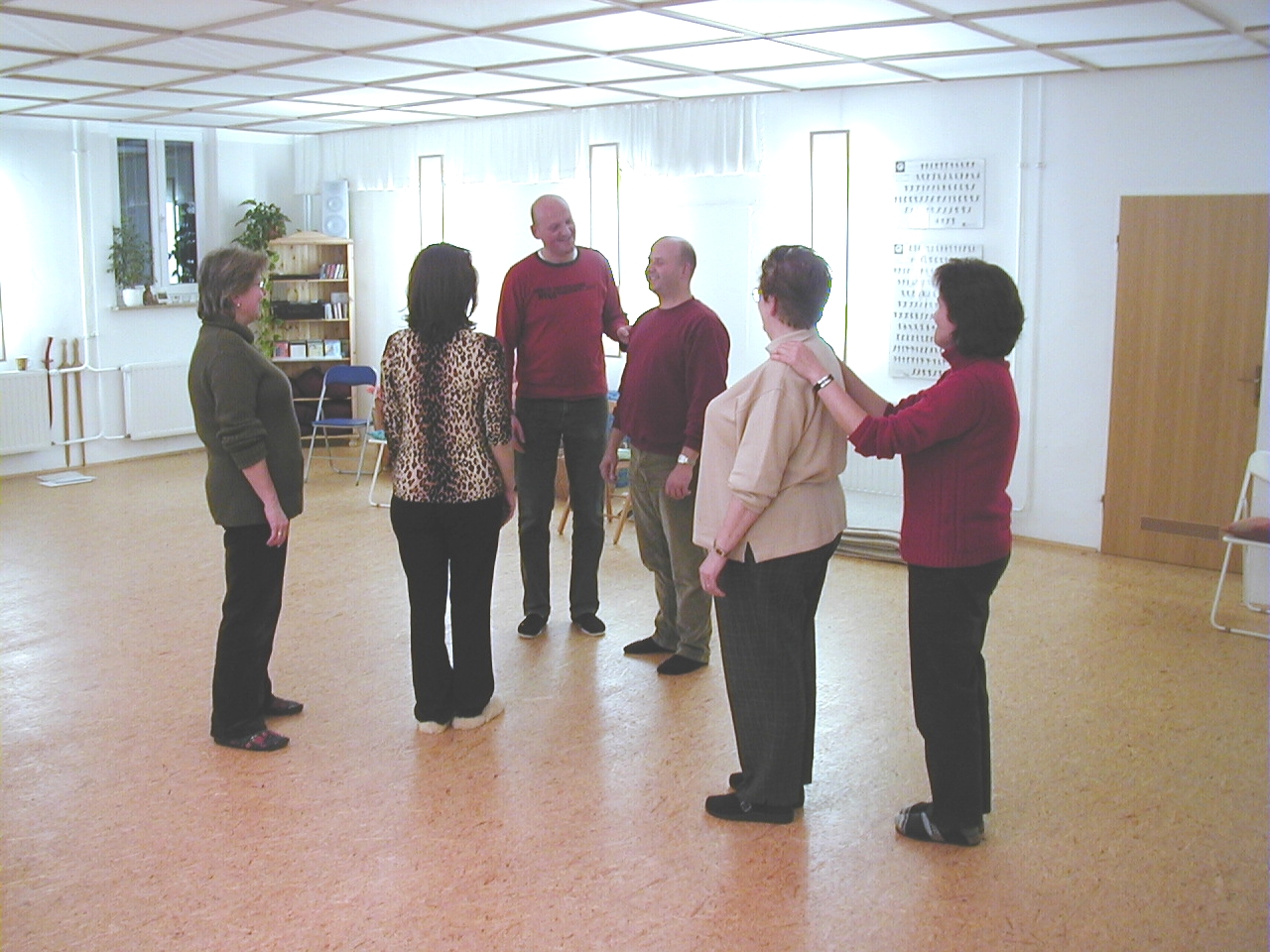 Wenn alle Elemente bestimmt sind, wählt meist der Klient aus den anderen Gruppenmitgliedern nach Gefühl Stellvertreter für die entsprechende Rolle und stellt sie dann im Raum nach seinem Empfinden auf. So erhalte ich sozusagen ein Raumbild des inneren Bildes des Klienten vom System.